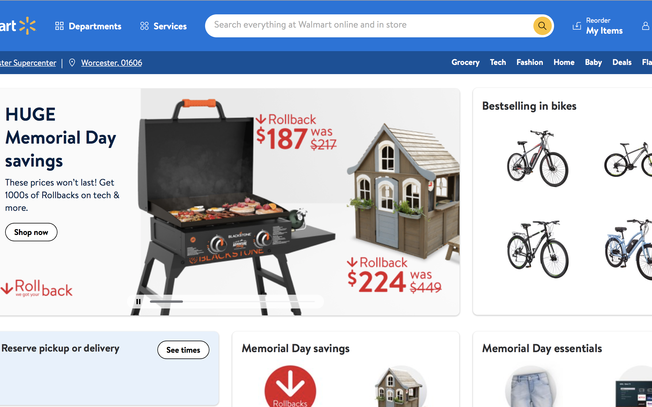 - The screen-to-text reader also skipped over the Search bar. I used the same function that I used for Target, aka the simple screen reader that Apple offers, by pressing Option + S. However, as I realized when I first completed this project, it may be a fault with this screen reading tech, and not the website’s fault. So, I used the more advanced “Voiceover” function in System Preferences. This function worked a lot better, and did allow me to hear the Search bar spoken aloud. When I clicked on various images on Walmart’s website, such as the bikes on the homepage, the Voiceover reader described what was in the image to me. However, this is most likely because it is a product, and the Voiceover tool was just reading the description of the product — there didn’t seem to be because there was alt. text for the image. I did not see any alt. text anywhere on the page. Therefore, I think this improvement (such as reading the search bar) comes from the better, more advanced text to speech tool, and not from the website itself. I am sure that true visually impaired people have much better screen to text readers, but without easily accessible alt. text, there is no way to read/hear what is on the screen. Walmart’s accessibility statement does say that they do have alt text, however I just couldn’t find it.